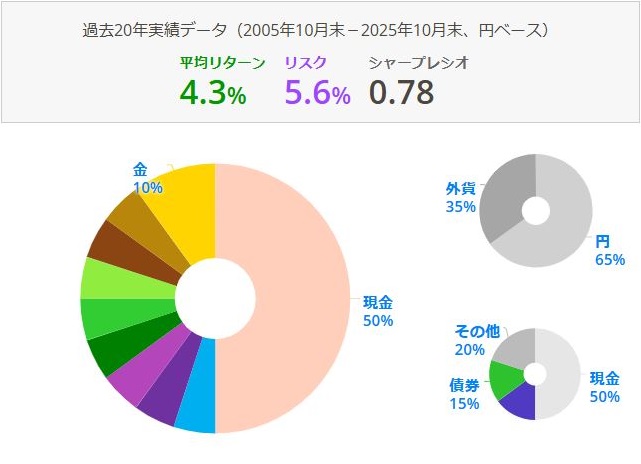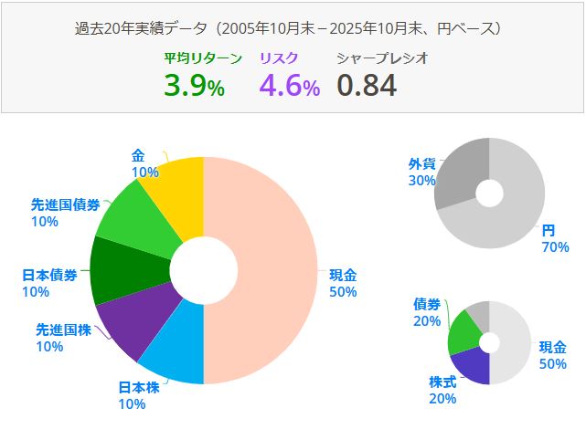 現金50%、国内株式10%、外国株式10%、国内債券10%、外国債券10%、金(ゴールド)10%の割合で6つのアセットに分散投資した場合のリスク&リターンは、このようになります。