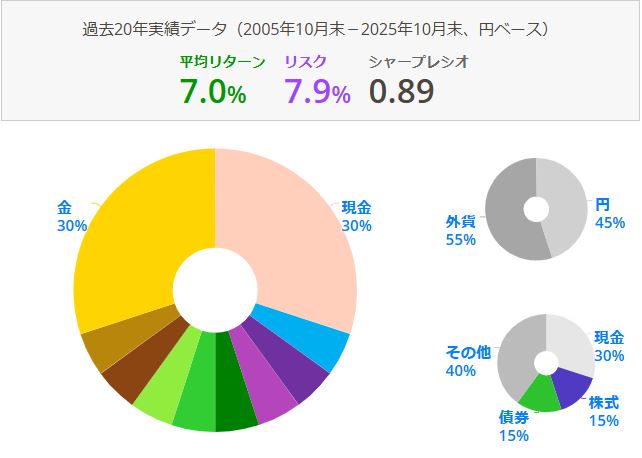 現金30%、8資産均等型40%、金(ゴールド)30%とした場合は、こちらです。