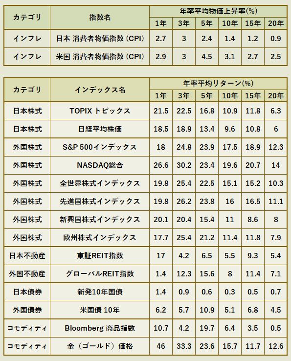 上表の上部はインフレ率、下部はアセット別の過去のリターンを掲載していますので必要に応じて適時ご確認ください。